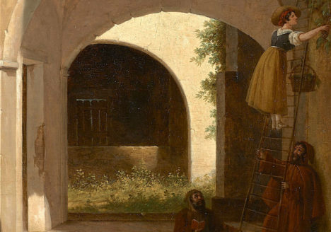 La cueillette indiscrète Guillaume-Frédéric RONMY Guillaume-Frédéric RONMY (Rouen, 1786 – Passy, 1854) « La cueillette indiscrète » - Huile sur panneau - une planche - signé et daté « Ronmy / 1822 » en bas à gauche – 31 cm x 24 cm -